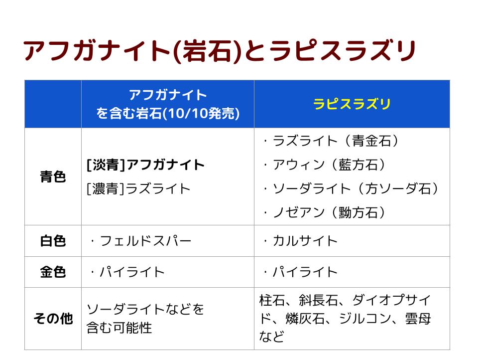 せっかくなので、今回のアフガナイト(を含む岩石)とラピスラズリの成分の比較も表にしてみました。
