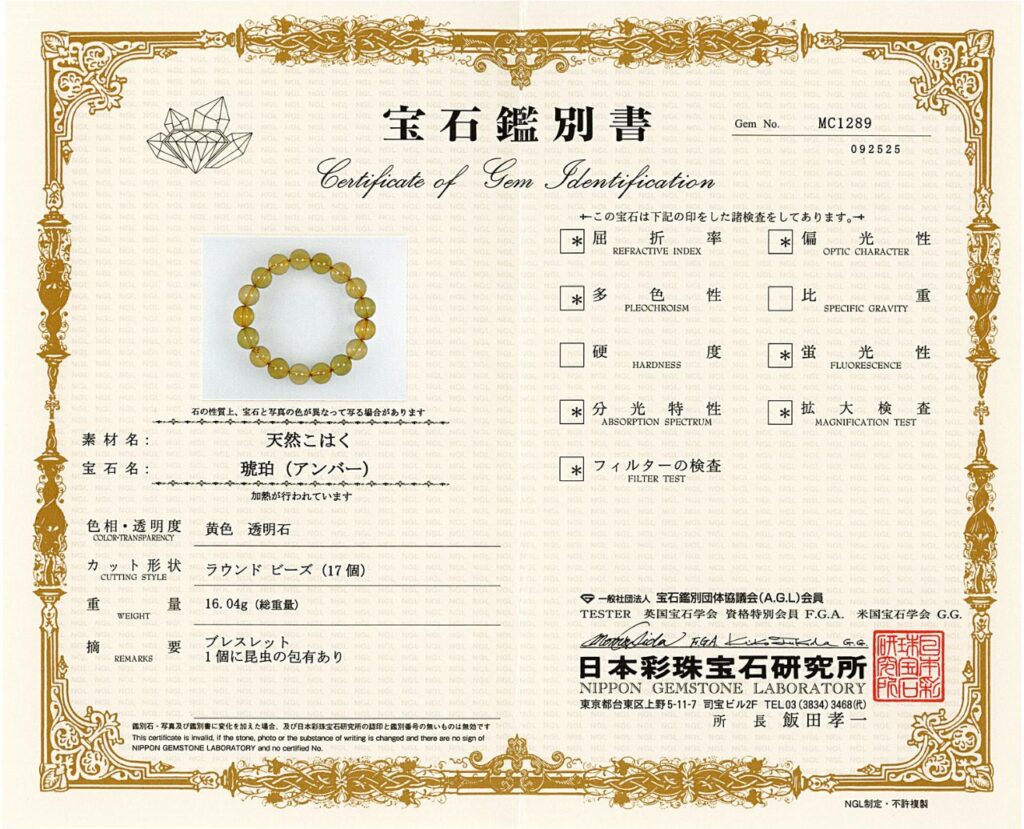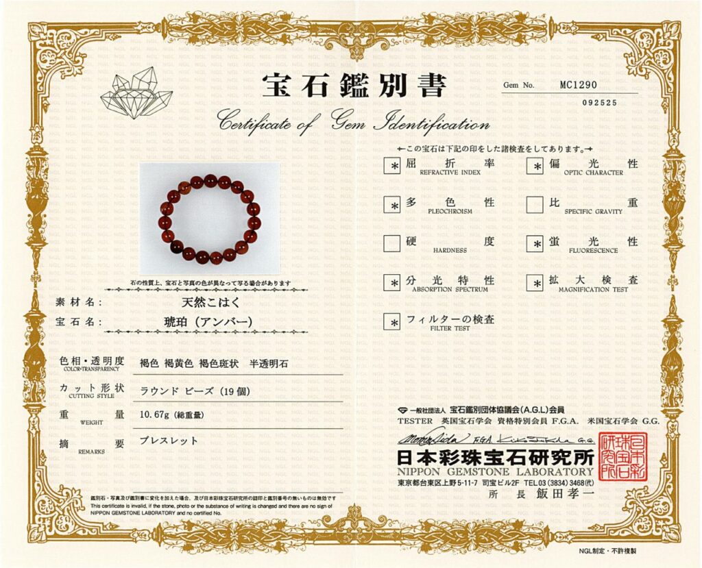 ブレスレットは鑑別付、天然こはくの証明書です。“こはく”は樹脂の化石であり、プラスチックで似たようなものを作ることができます。また、粉を固めたり加熱しながら変形させると天然こはくとは呼べなくなってしまうんですね。