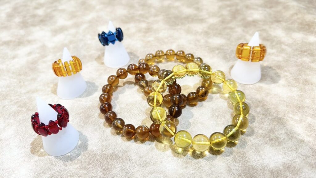リトアニアとインドネシア(スマトラ)の2ヵ所からやってきたアンバーのアクセサリーたち。ブレスレット3本とリングを4個ご用意しています。