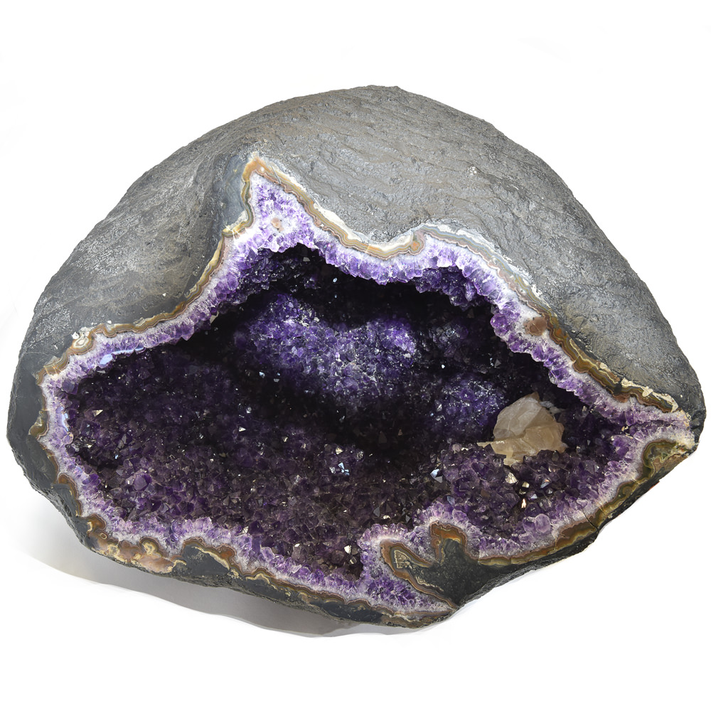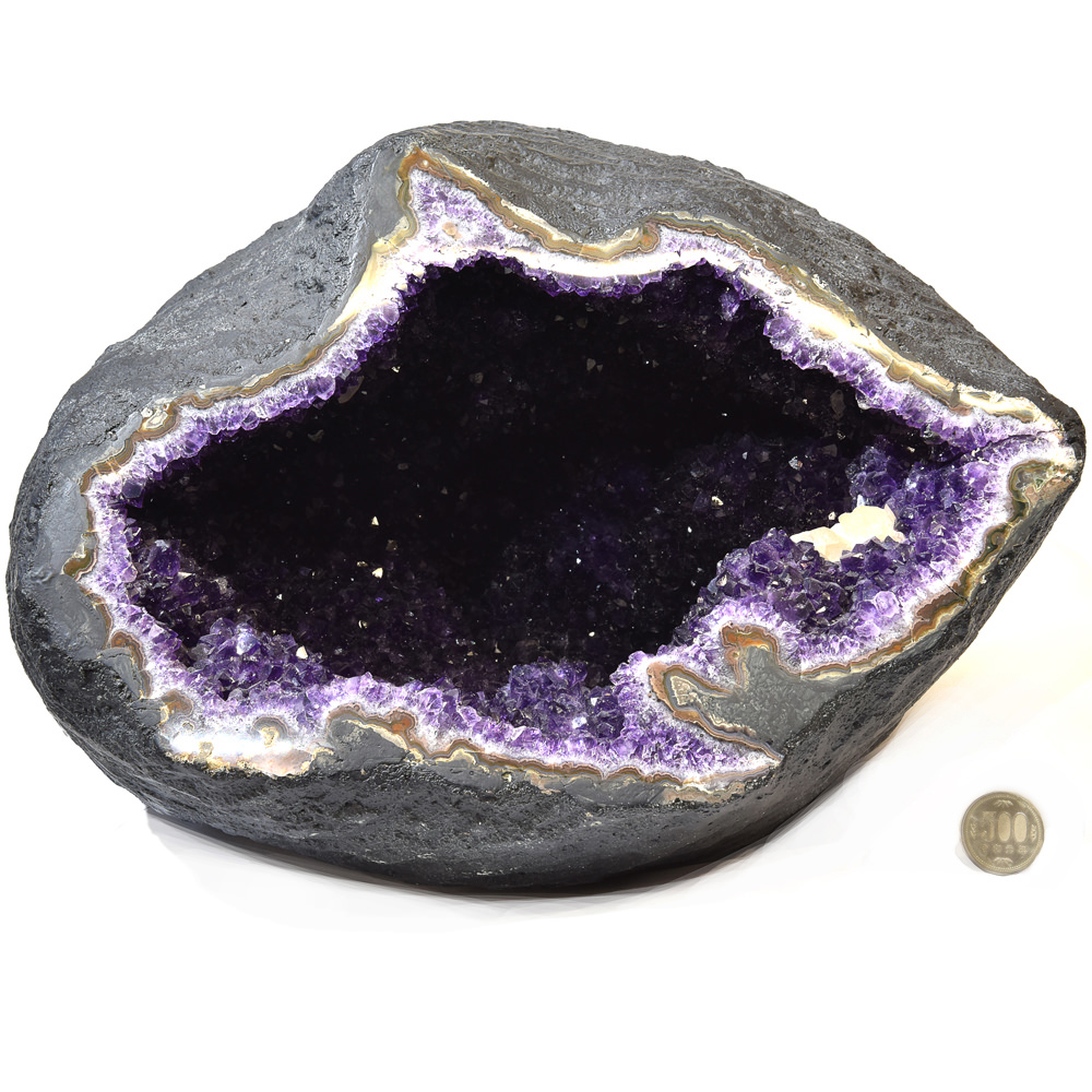 開口部から内部の奥深くまで、濃い紫色のアメジスト結晶がびっしりと成長しています。グレーの玄武岩質外殻とのコントラストも見事で、まさに「地球が作り出した芸術品」という表現がふさわしい標本です。