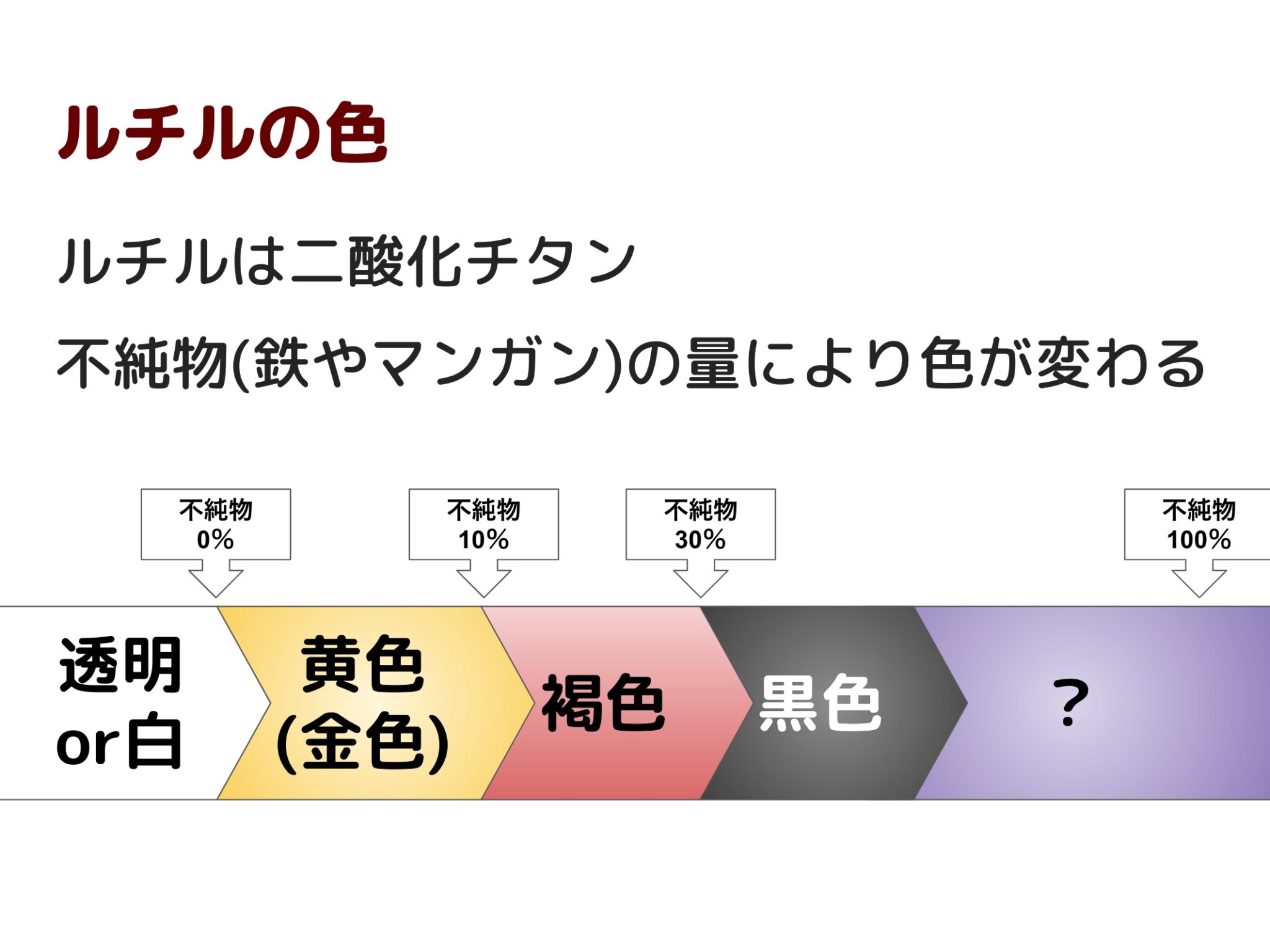 この色の変化は、ルチルに付着する不純物の量によって起こるんですね。