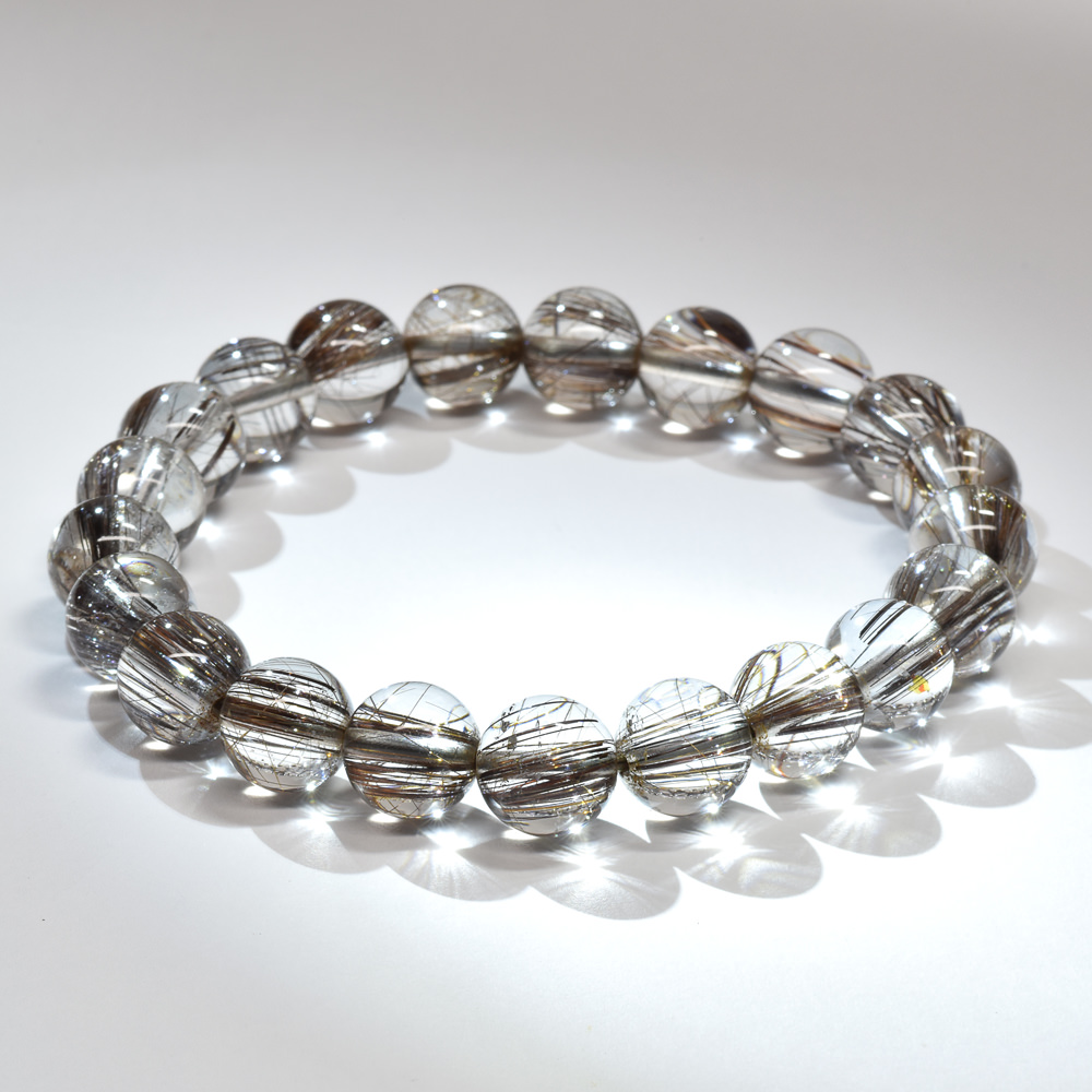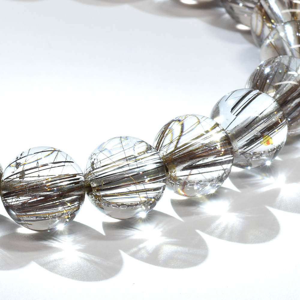 今回ご紹介するブレスレットは、透明度の高いクォーツの中に密集したブロンズルチルが放射状に伸び、まるで宇宙空間に漂う金属光線のよう。角度を変えるたびに光が針の一本一本に反射し、ブロンズからダークブラウンへと表情を変えます。