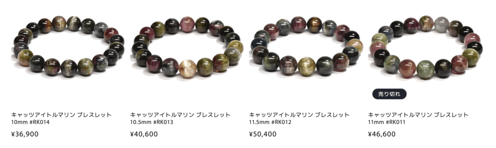 本日の新着商品は「キャッツアイトルマリン」のブレスレット4本です。色とりどりのトルマリンが一本のブレスレットで楽しめる逸品。もちろんキャッツアイ効果も存分にお楽しみいただけますよ!