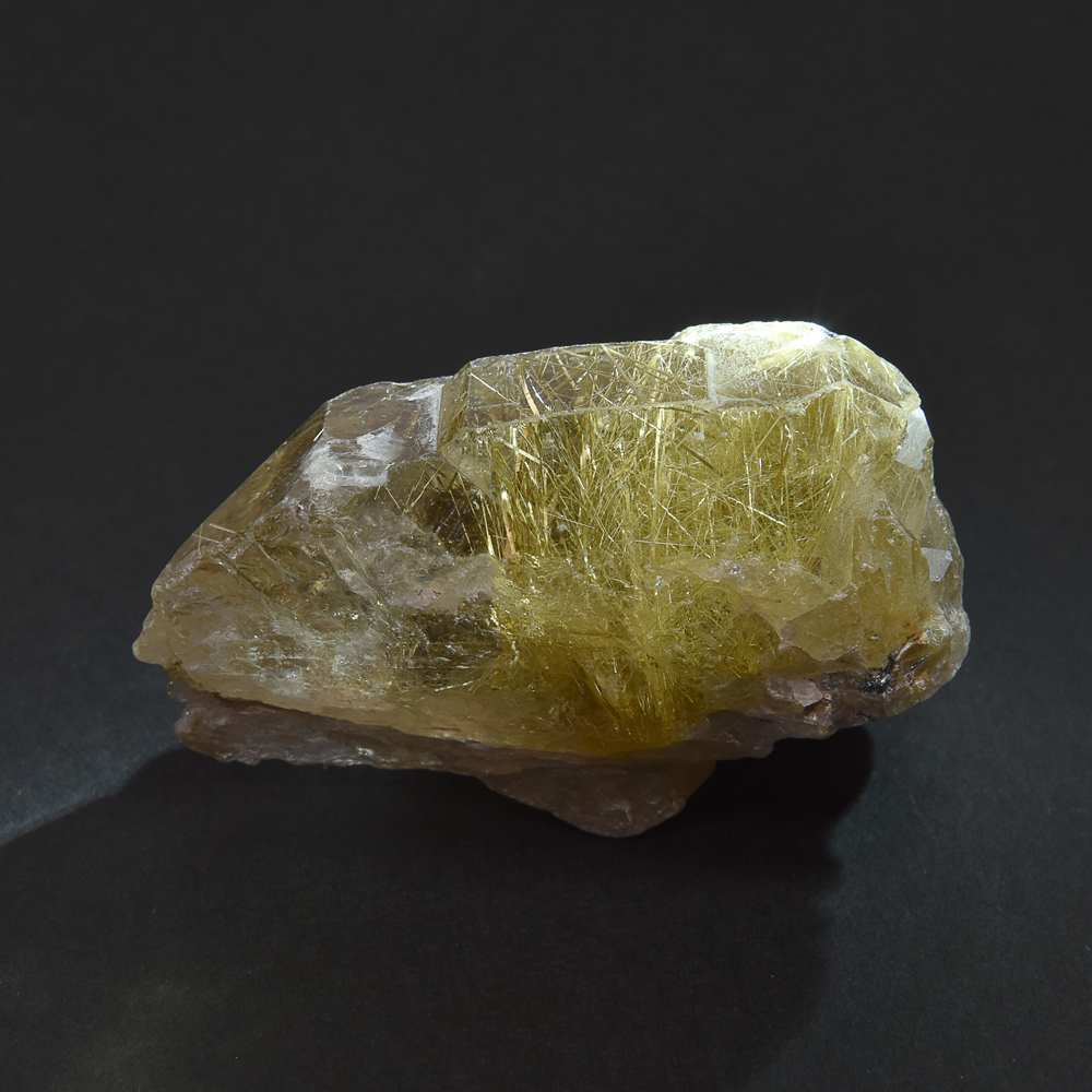 今回ご紹介する原石のベースとなっているのは、落ち着いた色合いが美しい透明度の高いスモーキークォーツです。その透明な結晶の中に、まるで黄金の光を閉じ込めたかのように、黄金色のルチル針が縦横無尽に、あるいは放射状に、文字通りたくさん内包されています。