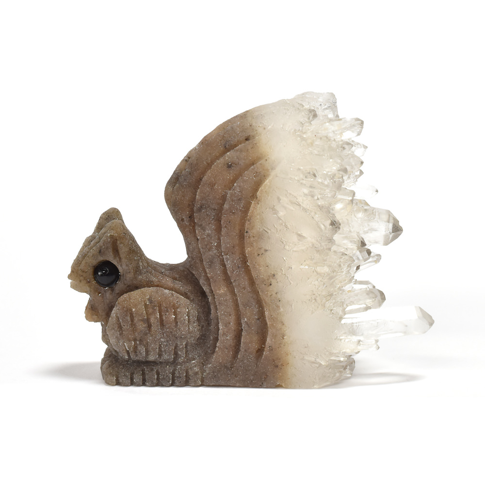 リスのボディ部分を母岩から彫り出し、しっぽの部分は水晶の結晶をそのまま活かしたデザイン。
